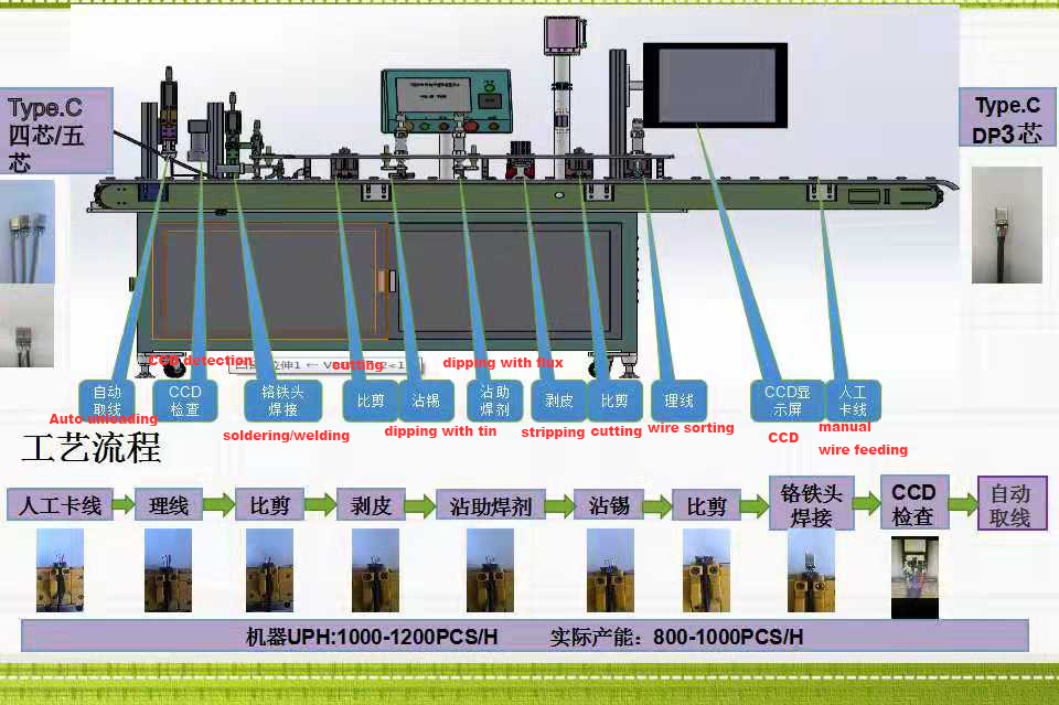 Manual wire clamping →wire sorting →cutting →peeling →dipping with flux →dipping with tin →cutting →welding/soldering →CCD inspection →automatic wire taking